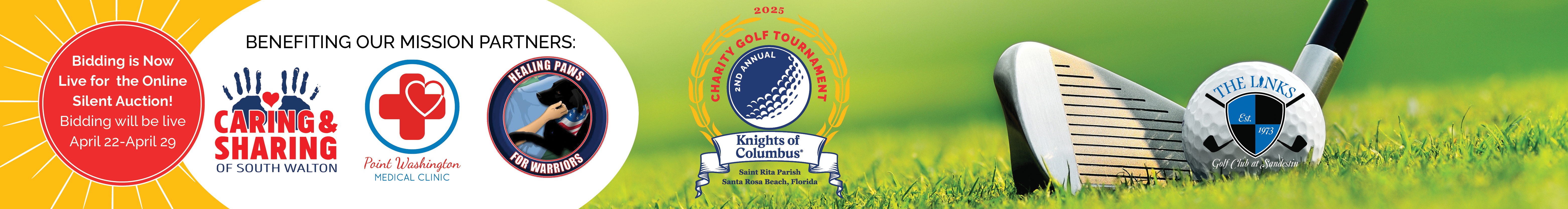 Thanks for helping those in need on the Emerald Coast by participating in our 2nd Annual Charity Golf Tournament Virtual Online Auction for 2025. Be assured that 100% of the proceeds of this Live Auction will be benefitting Healing Paws for Warriors, Caring & Sharing of South Walton and Point Washington Medical Clinic, all 501(c)3 charitable organizations.